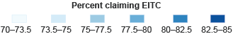 | NOTES: The dynamic U.S. map scrolls through Earned Income Tax Credit (EITC) take-up rates by state for tax years 2011 through 2018. The take-up rate is calculated as the percent of eligible households that claim EITC benefits (100=100 percent). In the legend, percentages on the left begin each range. Washington, D.C., is included in the results. SOURCE: IRS. |