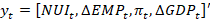 , where NUIt denotes net unauthorized immigration as a percent of the previous-year U.S. population, ΔEMPt is the annual growth rate of nonfarm payroll employment, πt is the PCE annual inflation rate, and ΔGDPt is yearly GDP growth. We postulate that these data are jointly explained by a structural VAR model.