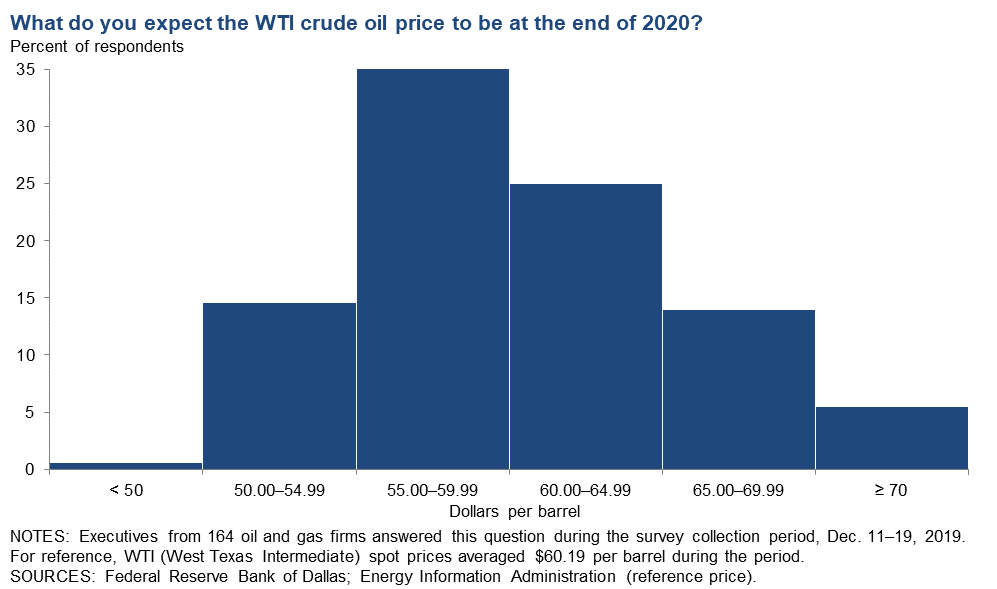 For this special question, executives were asked to provide a specific WTI crude oil price used for capital planning in 2020 at their firms. The average response was $54 per barrel, with the median and the mode both $55 per barrel. The average price used is the same as what was used for 2019 budgets (see results from last year’s special questions).