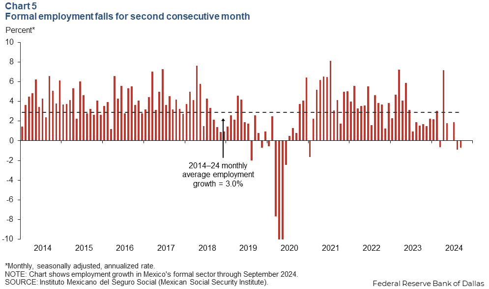 The Mexican currency averaged 19.6 pesos per dollar in September, down from August’s value of 19.2 pesos per dollar—a depreciation of 2.4 percent (Chart 6). The peso has been trending down since early 2024, likely as a result of domestic political uncertainty and in anticipation of the U.S. presidential election.