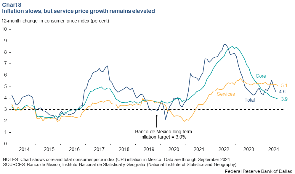 Mexico’s consumer price index (CPI) increased 4.6 percent in September over the prior 12 months, lower than the 5.0 percent rise in August (Chart 8). In addition, CPI core inflation, which excludes food and energy, slowed to 3.9 percent. Services inflation remained elevated at 5.1 percent growth. In September, Mexico’s central bank lowered its benchmark rate by 25 basis points to 10.5 percent. This is the third rate cut this easing cycle following a 25-basis-point reduction at the bank’s August meeting. In its statement, the central bank noted that the global inflation outlook has improved, while the closely watched core inflation rate—considered a reliable indicator for price trends—is expected to keep decreasing.