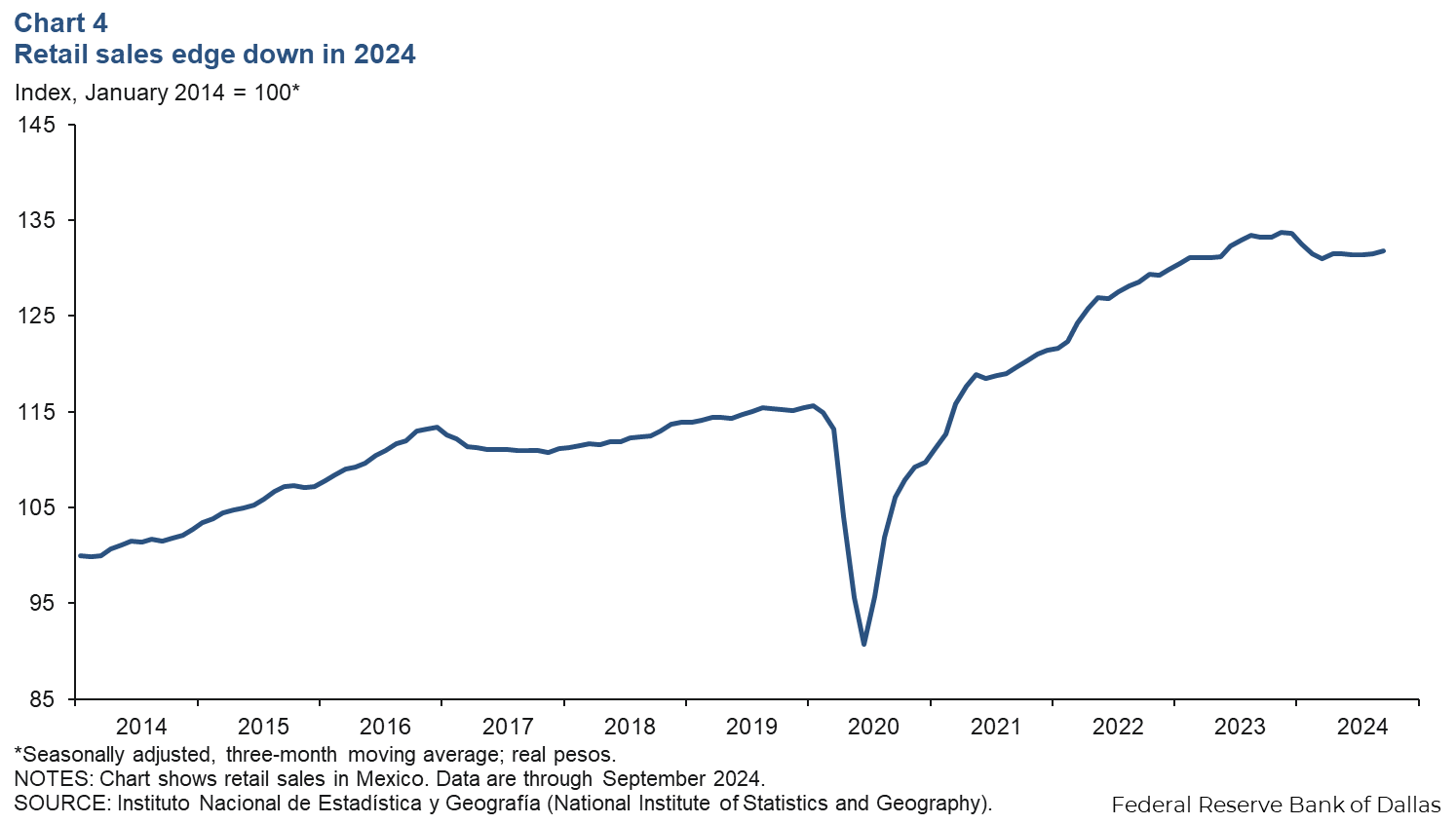 The three-month moving average of total Mexican exports declined 0.3 percent in October. Exports from the manufacturing sector, which accounts for the largest share of total exports, fell 0.4 percent. Meanwhile, oil exports dropped 1.0 percent (Chart 3). Year to date, total exports were nearly on par with the same period in 2023, with manufacturing exports up 0.9 percent and oil exports down 17.5 percent.