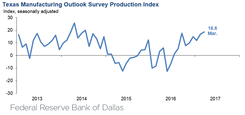 Texas factory activity increased for the ninth consecutive month in March, according to business executives responding to the Texas Manufacturing Outlook Survey. The production index, a key measure of state manufacturing conditions, rose two points to 18.6, suggesting output growth picked up pace this month.