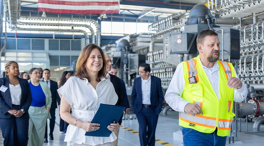 President Logan and other Dallas Fed leaders visited El Paso Water and toured the Kay Bailey Hutchison Desalination Plant, the largest of its kind in the United States. The plant takes in brackish groundwater and turns out up to 27.5 million gallons of fresh water a day. In addition, an on-site research facility at the desalination plant gives students, mostly from universities in the region, hands-on experience developing innovative water-supply solutions.