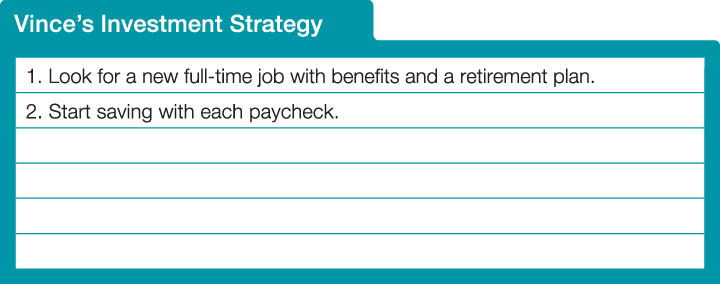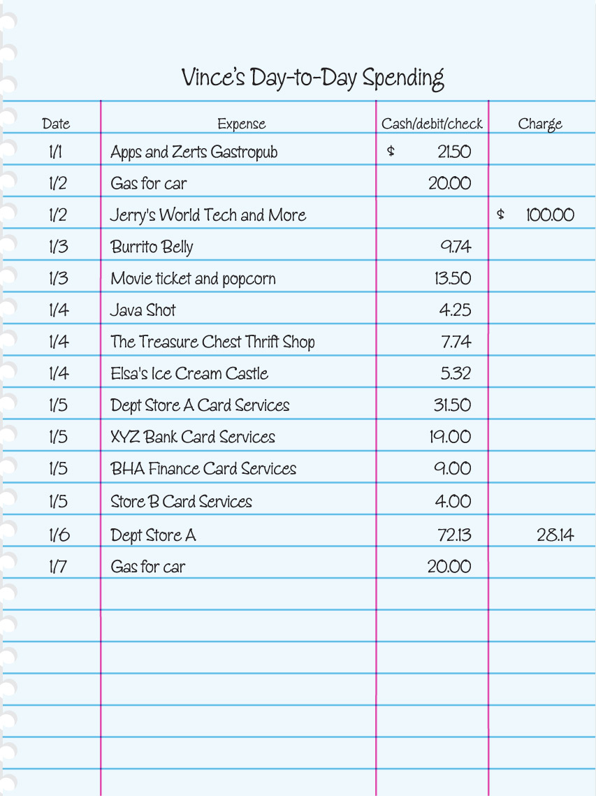 This is Vince, a 42-year-old writer who hopes to someday be the author of a great novel. After a period of unemployment, he lost his apartment and now rents a room in his sister’s home. Vince hopes to pursue his writing career and currently works as a bartender on weekends. He has racked up a sizable amount of credit card debt and hopes to move out of his sister’s home soon. He has decided to commit to building wealth the old-fashioned way, through budgeting to save, saving and investing, and building his credit.