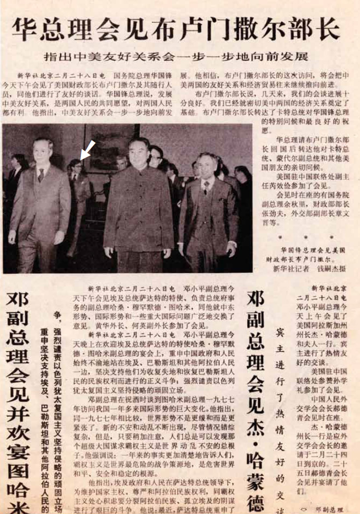 The second is the cover photo on the March 3 issue of the People’s Daily. This picture depicts Chairman Hua Guofeng, Mao Zedong’s placeholder successor, escorting Secretary Blumenthal (left), Undersecretary Tony Solomon (who later became president of the Federal Reserve Bank of New York) and, behind them, me and the rest of our delegation into the Great Hall of the People.