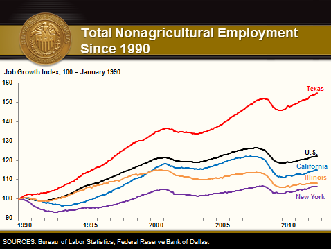 Working under the same federal fiscal and monetary policy as the rest of the United States, Texas has created over 50 percent more jobs than it had in 1990, whereas New York has expanded its nonfarm employment by a paltry 6 percent, Illinois by 8 percent and California by 14 percent.