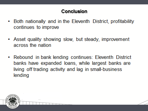 I am going to start today by reviewing current banking trends for the nation and for the Eleventh Federal Reserve District.