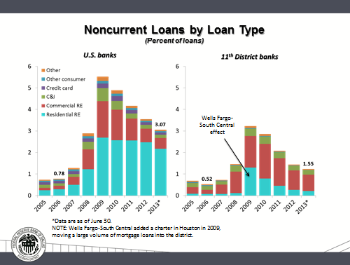 Note what is labeled on the center right side of the chart as the “Wells Fargo-South Central effect.” Wells Fargo relocated a charter to Houston in 2009 and moved a large volume of mortgage loans into the district, triggering the increase in nonperforming residential real estate. (If the Wells Fargo-South Central effect is excluded from the 2009 data, the noncurrent loan ratio falls by 71 basis points for the district.)