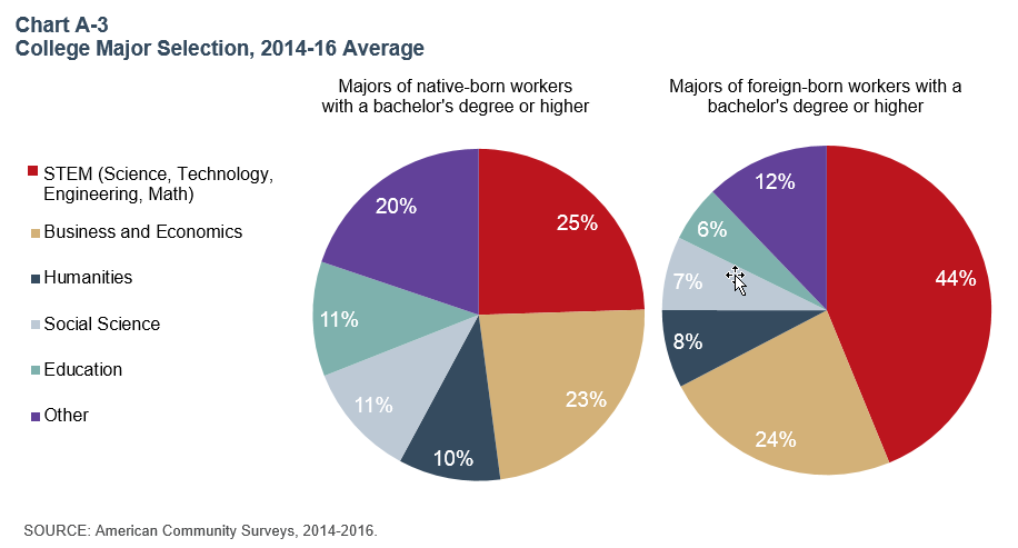 Immigration generally contributes to a larger labor force, which has benefits for economic growth, but high-skilled immigration has also been shown to positively influence productivity growth. Chart A-3 shows that nearly half of college-educated immigrants majored in science, technology, engineering or math (STEM). This far outpaces U.S.-born college-educated workers, about one quarter of which major in STEM fields. High-skilled foreign-born workers have also been shown to patent at higher rates than native workers, largely as a result of their concentration in the STEM fields.[13] This type of innovative activity has been shown to be a key factor in U.S. productivity growth in the post-World War II period.[14]