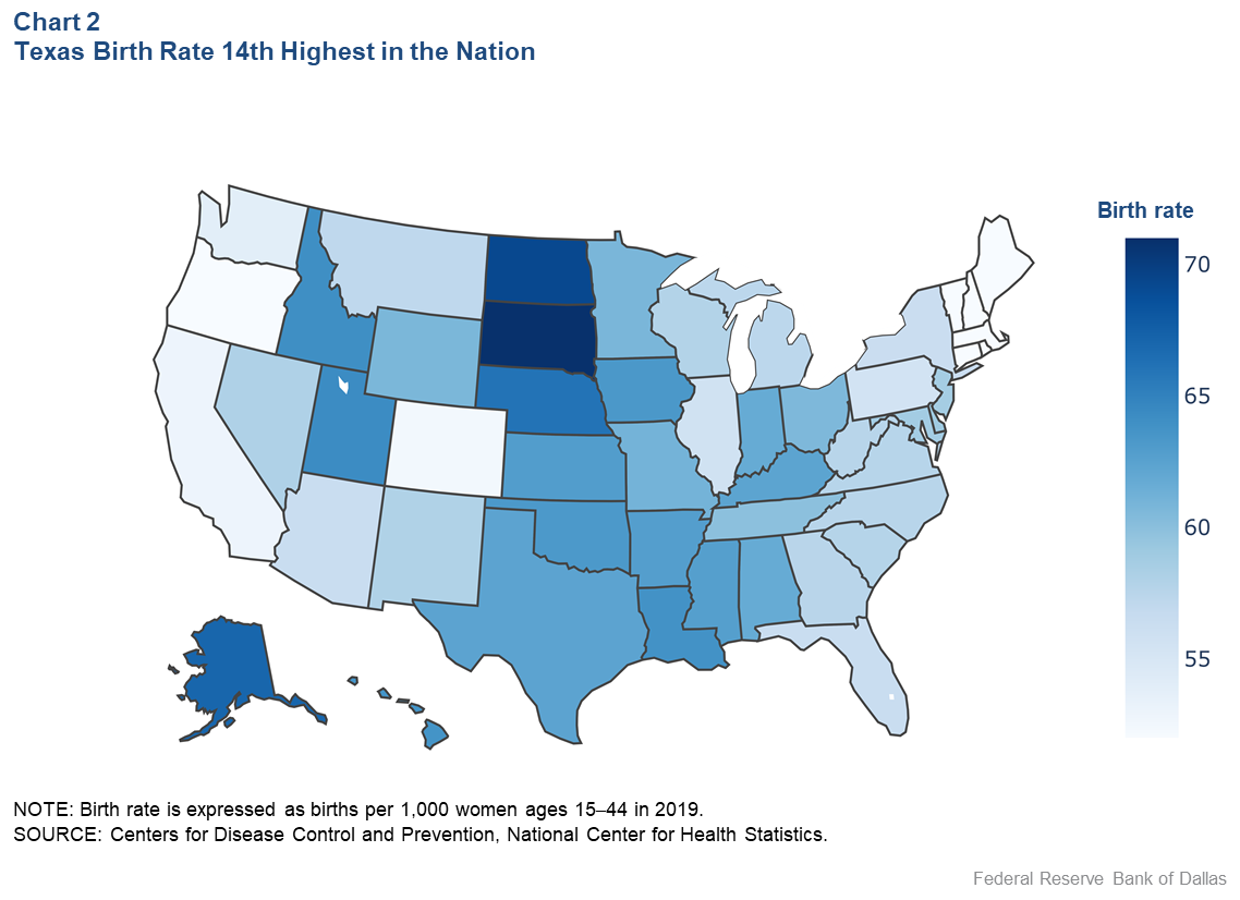 Women in Texas had a total fertility rate—the number of children one woman will have in her lifetime—of 1.8 children compared with the U.S. average of 1.7 children. Both the state and national rates were below the replacement rate—the number of children needed to sustain the size of the population in absence of migration—of 2.1.