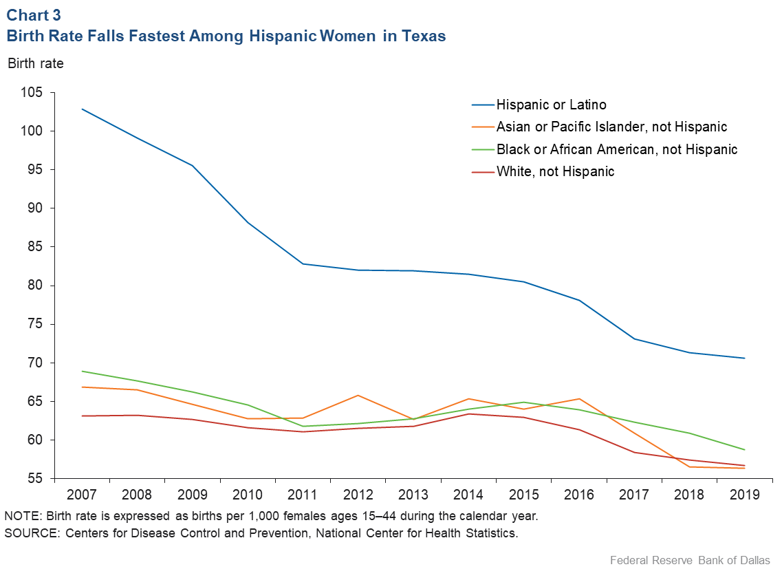 When fewer children are born, the population and economy grow more slowly. For now, high net migration into the state has aided Texas population growth. But migration can easily stop or reverse itself. In the long run, if growth is a concern, policymakers can address some of the factors that have led women to have fewer children.