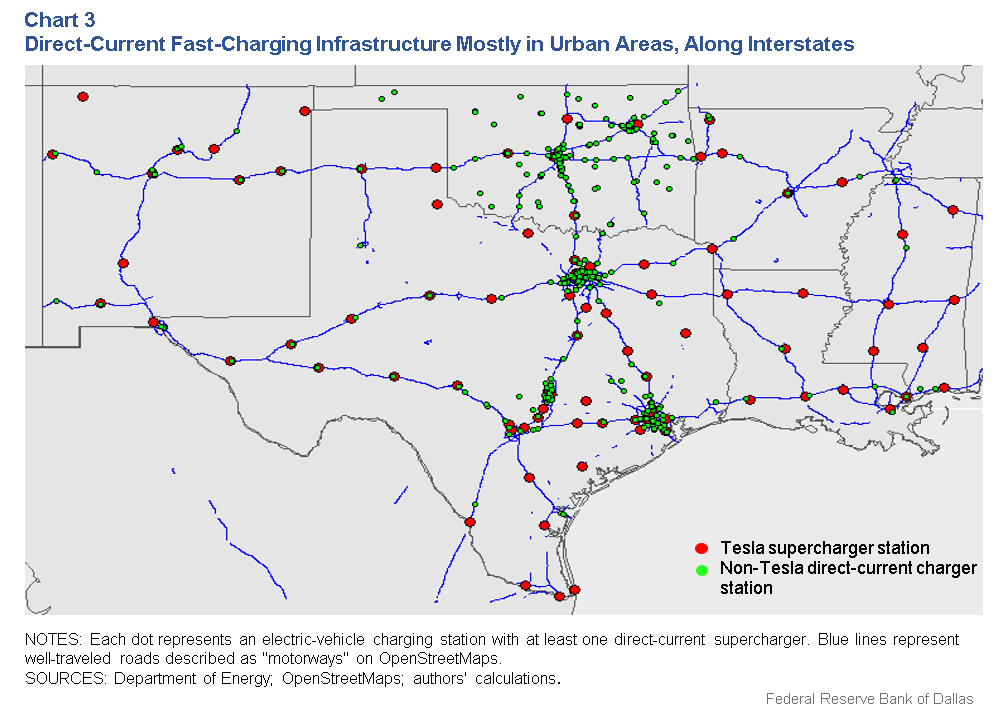 A similar infrastructure gap occurs when considering those who must charge away from home or work, particularly in rural areas, where there often exists limited availability of level 2 or DC chargers. Commercial charging stations are concentrated in urban areas and, to a lesser extent, along major throughfares, such as interstates, as is evident in Texas and most neighboring states (Chart 3). Areas away from main throughfares largely lack access to fast-charging infrastructure.