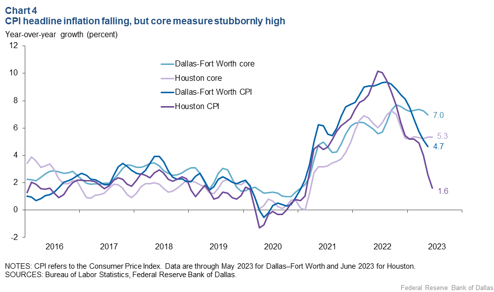 Official inflation data for Texas metros tell a similar story. Although the 12-month Consumer Price Index (CPI) for Houston declined to 1.6 percent in June, core CPI (all items except food and energy) remained at 5.3 percent (Chart 4). Headline and core CPI growth rates in Dallas–Fort Worth exhibited a similar pattern in May.