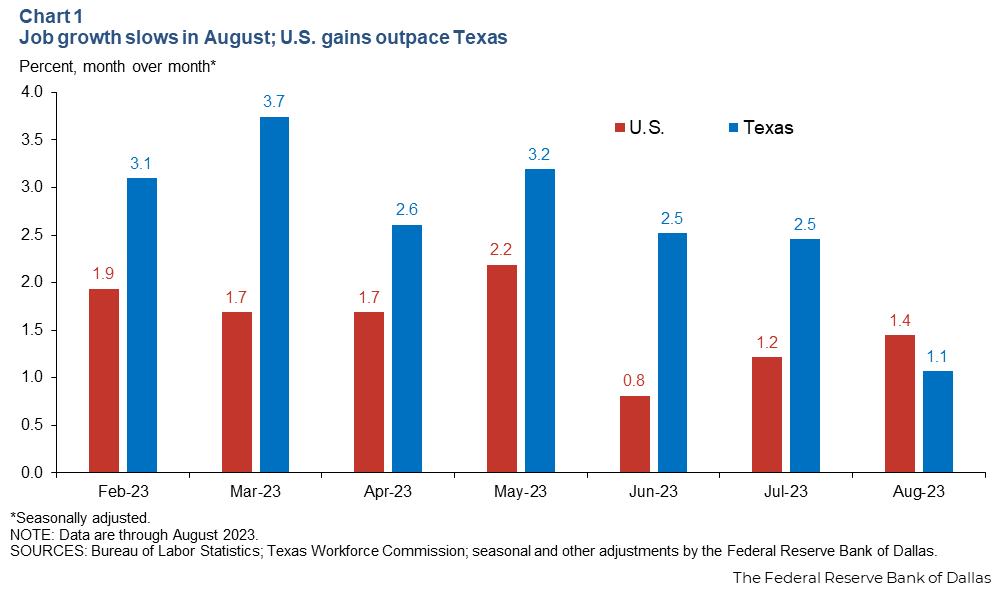 Texas job growth slowed in August, expanding only 1.1 percent at an annualized rate, equivalent to adding 12,401 jobs (Chart 1). By comparison, the nation’s employment grew 1.4 percent, outpacing Texas for the first time since November 2022.