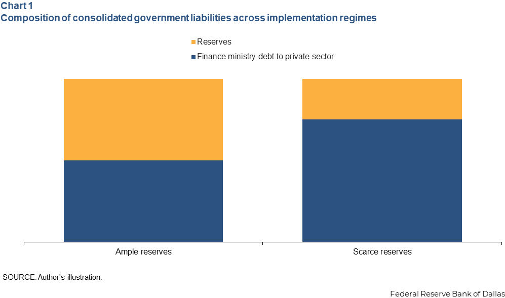 The consolidated government’s total liabilities are the same in both regimes: D = F(r). However, the composition of liabilities varies across regimes. Chart 1 illustrates this variation. The scarce-reserves regime increases consolidated finance ministry debt to the private sector relative to the ample-reserves regime.