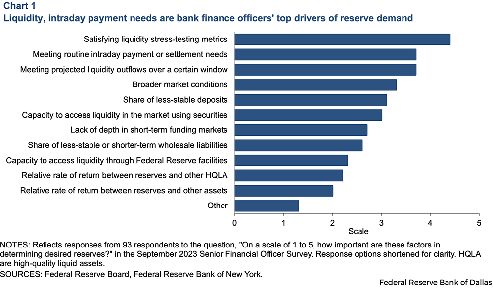 The Federal Reserve’s September 2023 Senior Financial Officer Survey reported that satisfying liquidity stress-testing metrics, meeting projected outflows and meeting routine intraday payment or settlement needs were the most important determinants of an institution’s desired level of reserves (Chart 1).