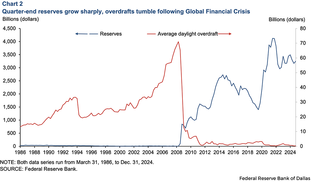 In 2005, the average daily value of payments made through the Fedwire Funds Service (the Fed’s large-value payment system) was around $2 trillion. By 2024, the average daily payments value rose to roughly $4.5 trillion. Over this same period, reserves grew to an average of $3.2 trillion from just $12 billion. The significantly lower level of reserves pre-crisis was sufficient for banks to manage intraday payment needs and for funding markets to function efficiently, in part because banks made liberal use of daylight overdrafts.