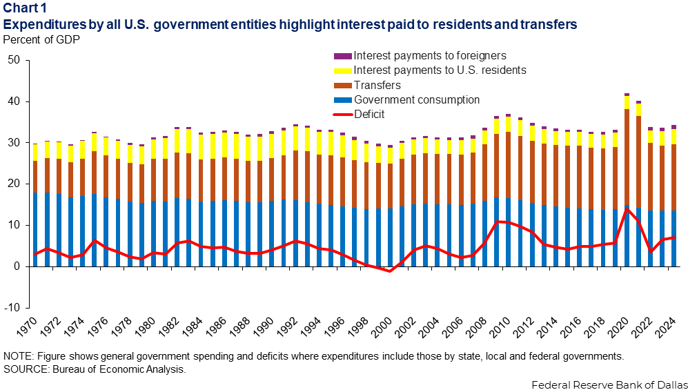 From 1970 to 2024, government current expenditures rose from around 30 percent of gross domestic product (GDP) to 34 percent of GDP, while government revenue remained fairly constant at 27 percent of GDP.