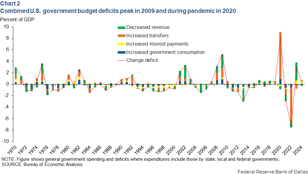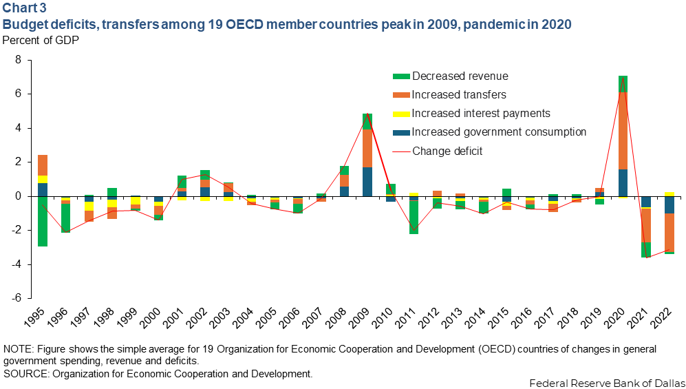 In response to both the Global Financial and pandemic crises, government transfers increased around the world as leaders attempted to alleviate economic strain. Both times it was a leading cause of higher budget deficits.