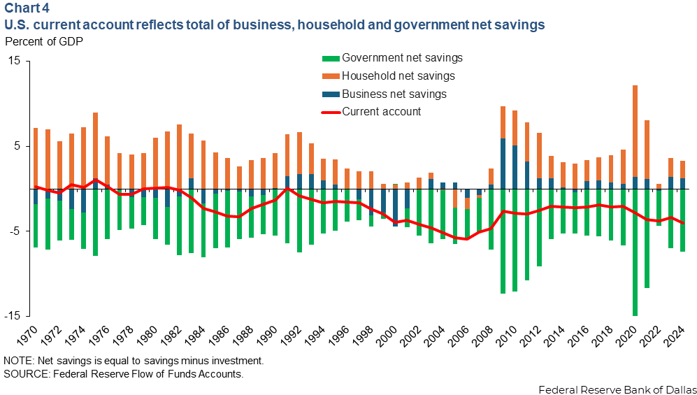 Beyond government borrowing by itself, government net savings is one part of overall net national savings (Chart 4). The sum of net savings across federal, state and local governments, U.S. households and businesses equals the U.S. current account—net savings for the economy as a whole.