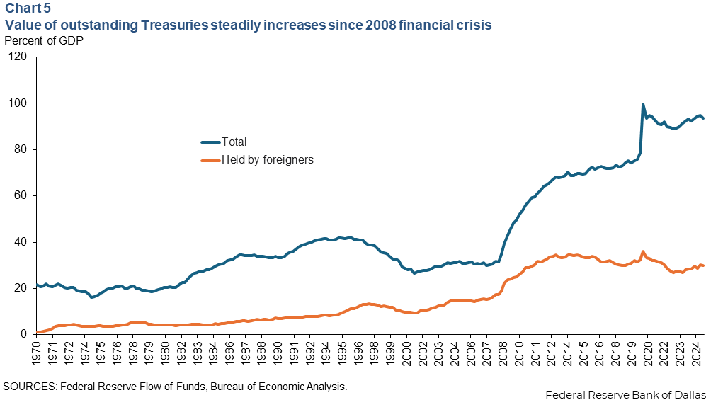 The value of outstanding Treasuries fluctuated between 20 and 40 percent of GDP from 1970 to 2008; it then rose to nearly 70 percent of GDP in the five years after the 2008 crisis, increasing again after the pandemic crisis (Chart 5). It is at about 93 percent of GDP currently.