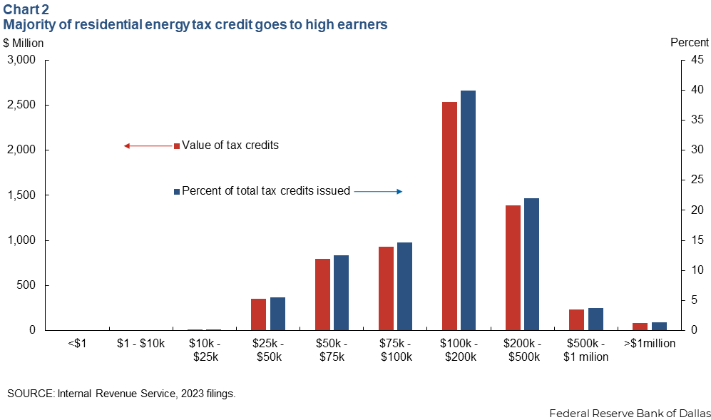 Thus, high income earners receive most of the benefit from the residential clean energy credit (Chart 2). Just under 1.25 million tax returns had residential energy credit attached in the 2023 tax year. The credit claimed that year totaled $6.3 billion.