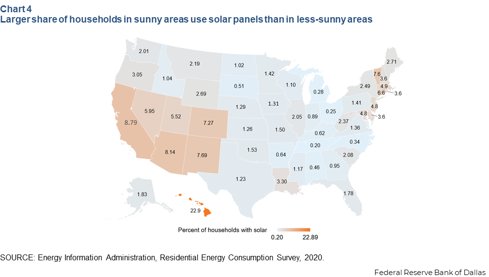 Residential solar also is not always the most economically efficient use of the marginal solar resource, since many areas in the country, such as Washington state, do not receive nearly the level of sun that Texas and Arizona do. The residential solar tax credit, by offering the same cost-based subsidy independent of geography, caused deployment of solar resources in suboptimal solar resource areas (Chart 4).