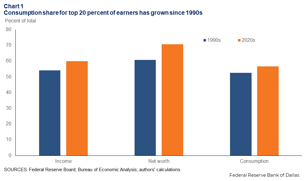 We combine these sources with the Bureau of Economic Analysis measure of total disposable personal income to create estimates of disposable income and savings to measure consumption for the top 20 percent of earners. We find that quintile is responsible for 57 percent of overall consumption on average from 2020 to the second quarter of 2025.