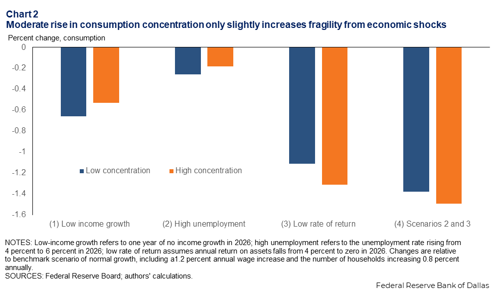 Compared with an economy with low consumption concentration, the current economy with high consumption concentration is more vulnerable to downside risks in return on assets and less vulnerable to a temporary slowdown in the labor market. Quantitatively, the effects are small. Consumption concentration may be up but has resulted in little heightened economic fragility.