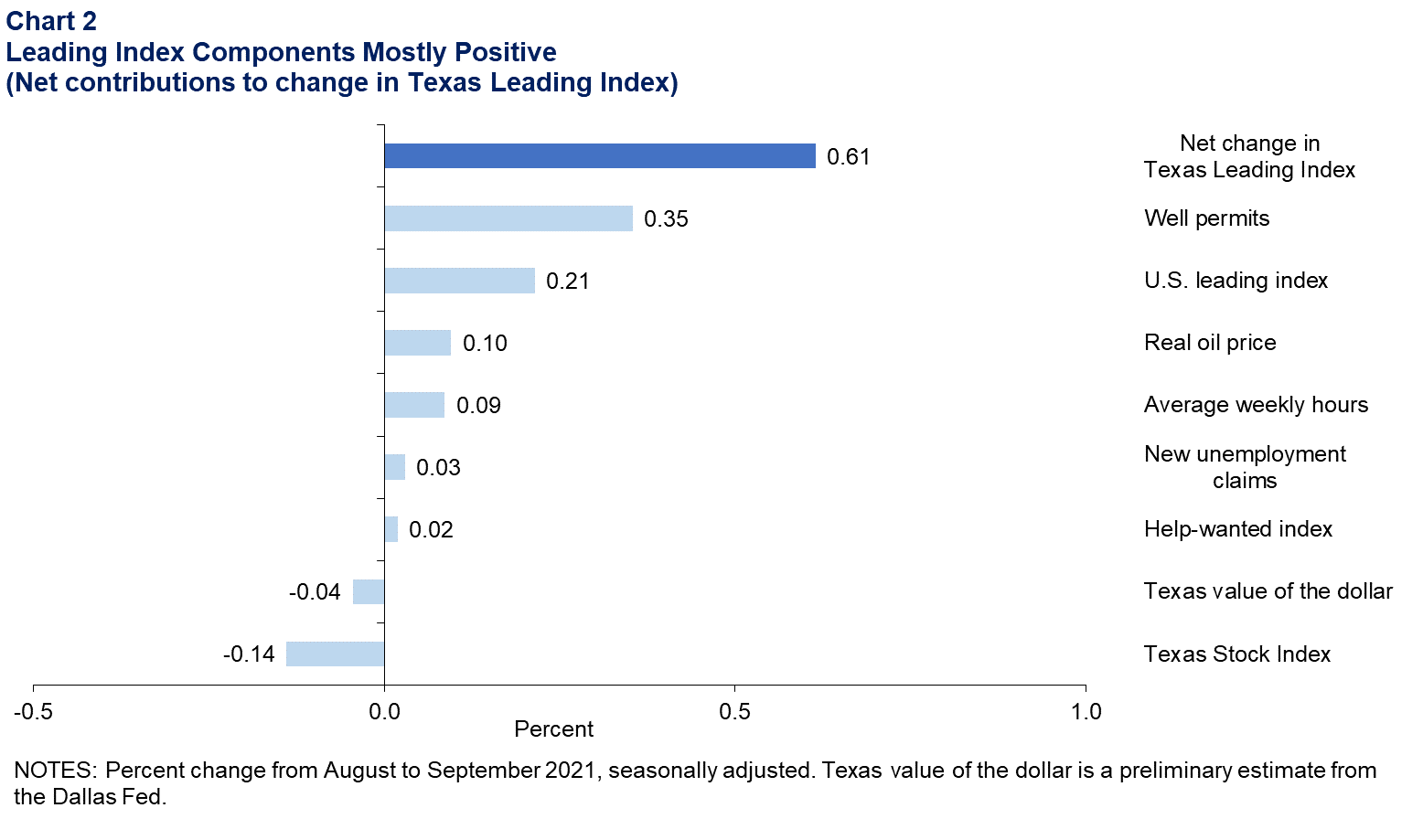 The Texas Leading Index grew strongly in September, with six of the eight indicators giving positive contributions (Chart 2). The increase in the index was concentrated in a significant improvement in the energy indicators and leading indicators of the national economy. Permits to drill oil and gas wells, the oil price, the U.S. leading index, average weekly hours worked in manufacturing, new unemployment claims and the help-wanted index all contributed positively to gains in the index. In contrast, a slight increase in the Texas trade-weighted value of the dollar and a mild decline in the stock prices of Texas-based companies contributed negatively.