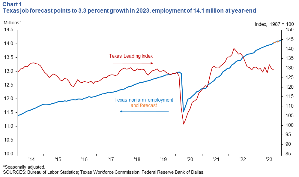The Texas Employment Forecast indicates that jobs will increase 3.3 percent in 2023, with an 80 percent confidence band of 3.1 to 3.5 percent. The forecast is based on an average of four models that include projected national GDP, oil futures prices and the Texas and U.S. leading indexes. The forecast suggests that 453,200 jobs will be added in the state this year, and employment in December 2023 will be 14.1 million (Chart 1). It implies growth for the rest of the year will be an annualized 2.5 percent.