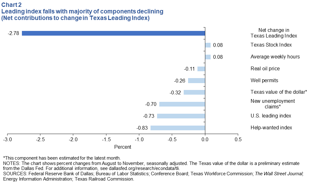 The Texas Leading Index decreased over the three months through November (Chart 2). Negative contributors to the index included decreases in the help-wanted index, the U.S. leading index, well permits, the real price of West Texas Intermediate oil and increases in new unemployment claims and the Texas value of the dollar. In contrast, an increase in average hours worked and the Texas Stock Index pushed the index upward.