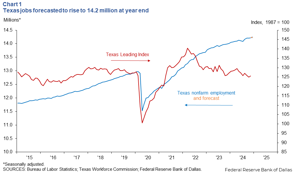 The Dallas Fed’s Texas Employment Forecast projects job growth for the calendar year and is estimated as the 12-month change in payroll employment from December to December.
