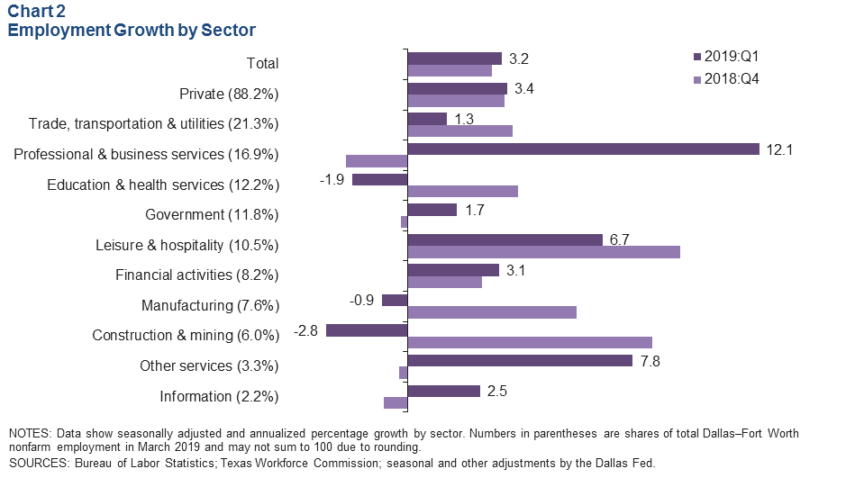 Jobs in DFW grew at a 3.2 percent annualized rate in the first quarter—the fastest pace since third quarter 2016, when employment expanded 4.5 percent. Growth was mixed, with payrolls in the goods-producing sector contracting an annualized 1.7 percent. Expansion among service-providing industries was led by a surge in professional and business services employment (Chart 2). Hiring in leisure and hospitality and other services was also strong, particularly in Dallas. Job growth accelerated in financial activities in the quarter but moderated in trade, transportation and utilities as a result of payroll declines in Fort Worth’s retail trade and transportation, warehousing and utilities industries. Education and health care employment contracted over the three-month period, partly due to a slowdown in health care and social assistance hiring.