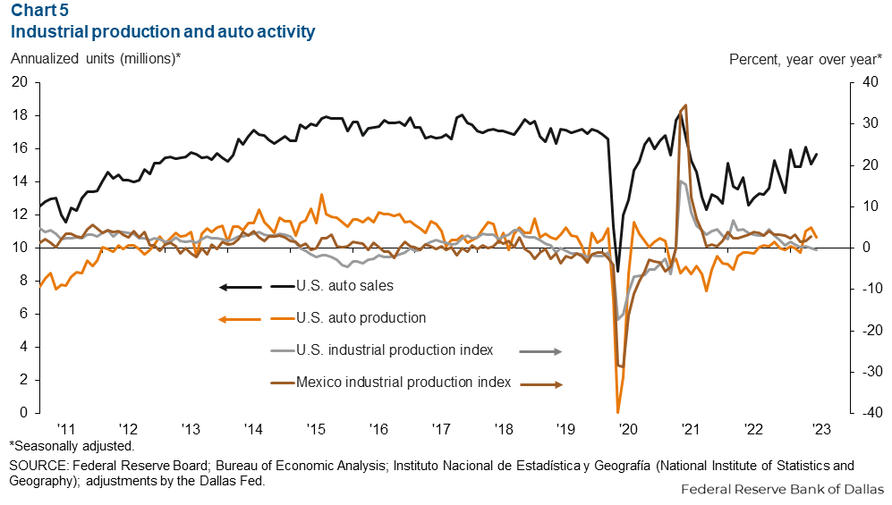 In June, the monthly U.S. industrial production (IP) index declined year-over-year from last June for the first time since February 2021, decreasing 0.4 percent (Chart 5). The index fell 0.5 percent from May to June 2023. The Institute for Supply Management (ISM) index dropped 0.9 percentage points in June to 46, down 7.1 points from June last year. ISM indexes below 50 signal contraction in the manufacturing sector. Meanwhile, the Mexico IP index increased 1.0 percent from April to May and was up 2.8 percent from May last year.