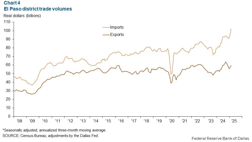 El Paso’s economy is highly dependent on international trade. Total smoothed trade volumes through El Paso grew to $161.3 billion in February, representing a 4.9 percent increase from January and a 21.3 percent increase compared with February 2024 (Chart 4). Imports rose notably, up 6.6 percent in February, and exports rose a more modest 2.1 percent. Contacts note that the pickup in trade activity at the beginning of the year could be a result of firms making purchases ahead of the tariffs.