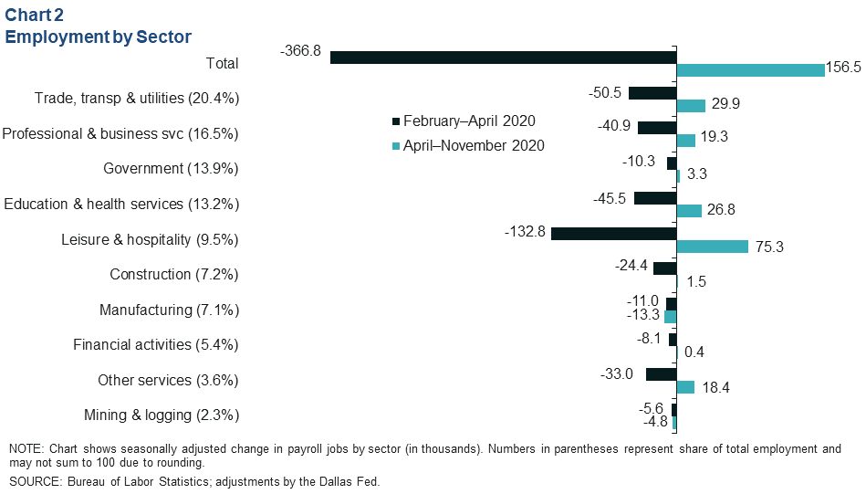 With over 9,000 jobs added in November, Houston payrolls have recouped 156,500 jobs from the 366,800 jobs lost from February to April (Chart 2). Year to date, that puts Houston at an annualized decline of 6.8 percent in 2020—similar to the U.S., which was down an annualized 6.7 percent. By comparison, Texas’ drop was a more modest 5.6 percent.