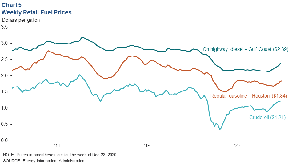 Economic indicators for Houston were mixed heading into the end of 2020. Houstonians left home to engage in economic activity less frequently in December, likely due in part to the combined effects of the holidays and the worsening pandemic. Payroll employment continued to recover broadly through November, except for ongoing weakness in the oil and gas sector. Energy saw a surge in bankruptcy filings in 2020. However, energy prices and drilling activity ended 2020 on higher ground compared with most of the year.