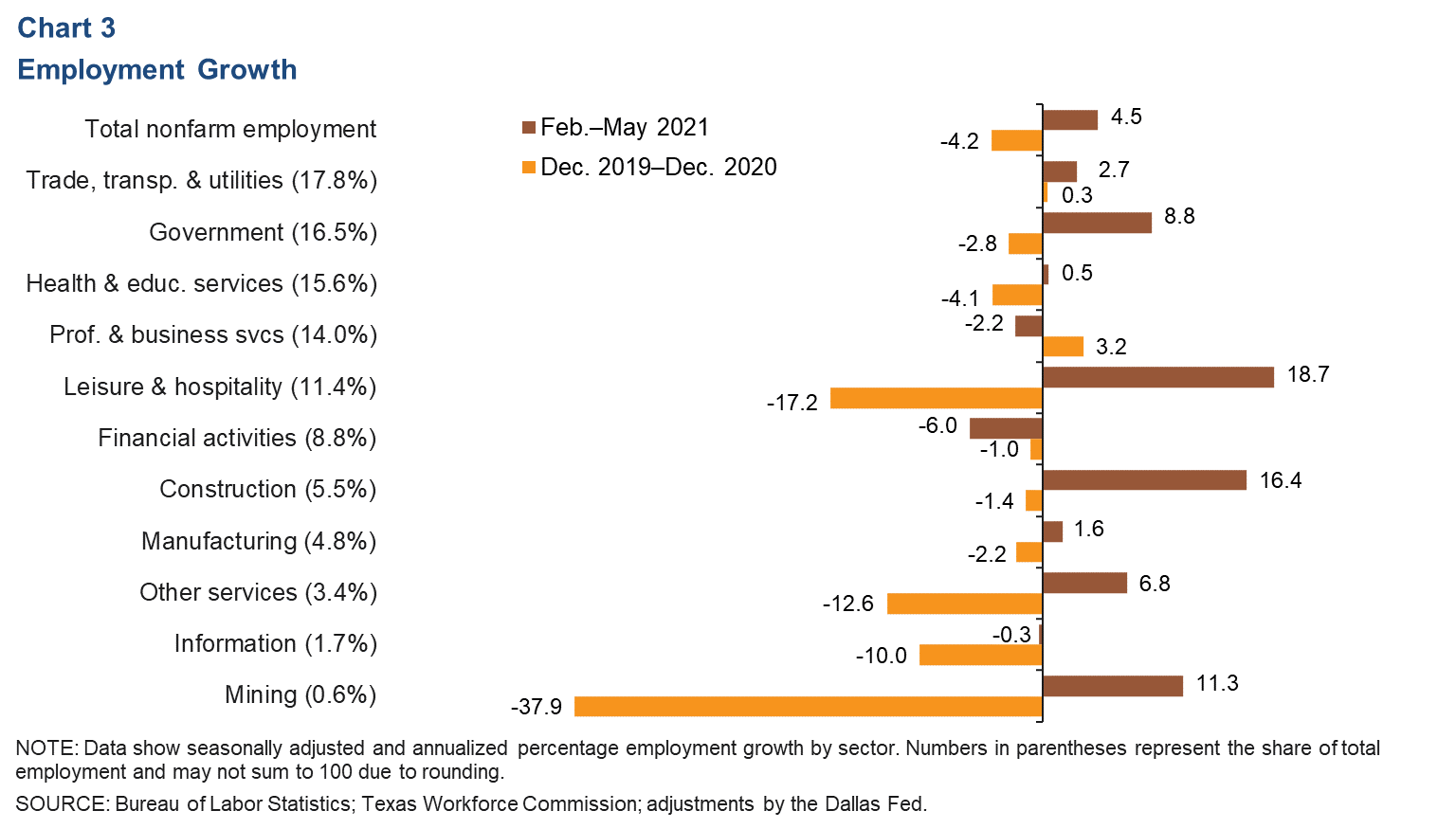 Net payrolls in San Antonio expanded an annualized 4.5 percent (11,445 jobs) in the three months ending in May, with positive performances across most sectors (Chart 3). Leisure and hospitality led the growth (18.7 percent, or 5,050 jobs) and was followed by construction (16.4 percent, or 2,180 jobs), government (8.8 percent, or 3,620 jobs) and other services (6.8 percent, or 580 jobs). Industries that posted net declines were financial activities (-6.0 percent, or 1,445 jobs), professional and business services (-2.2 percent, or 830 jobs) and information (-0.3 percent, or 15 jobs). In March and April 2020 combined, 130,511 jobs were lost as the pandemic hit. As of April 2021, 76.4 percent of those jobs had been recovered.