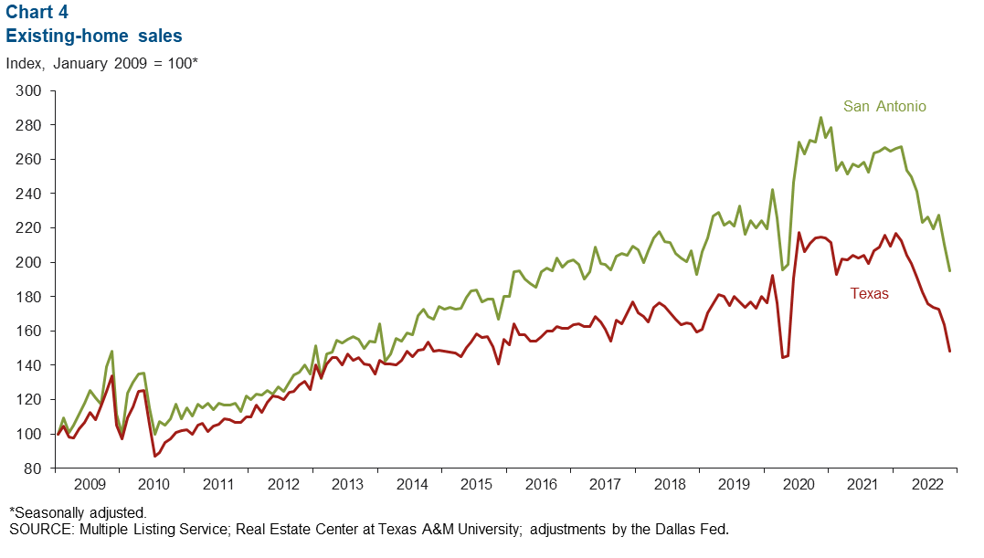 San Antonio’s existing-home sales continued to decline during November, falling by 7.3 percent, slower than the 9.3 percent decrease statewide (Chart 4). Similarly, while San Antonio experienced a 26.9 percent decrease in existing-home sales year over year, it remained below the state’s decline of 31.3 percent. Now, existing-home sales rates in both San Antonio and Texas are at levels seen in early 2020.