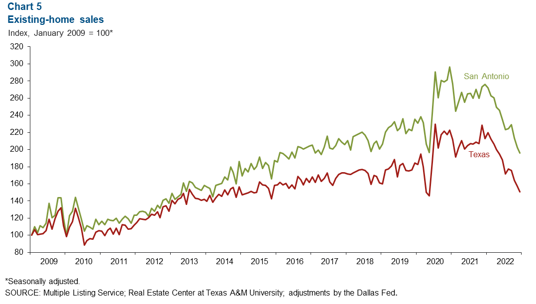 San Antonio’s existing-home sales fell an annualized 3.2 percent in December, less than November’s 5.0 percent drop and the 3.9 percent decline statewide (Chart 5). Year over year, San Antonio sales dropped 28.9 percent, similar to Texas’ 29.1 percent decline. Existing-home sales are at levels last seen around the onset of the COVID-19 pandemic in early 2020 in both San Antonio and Texas.