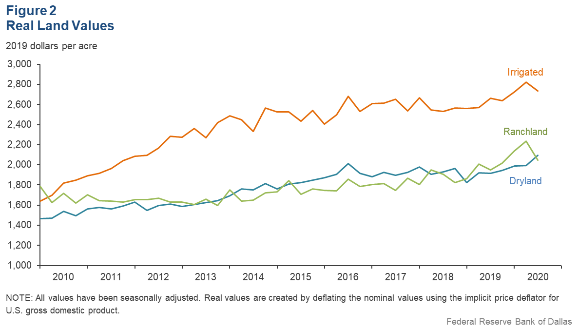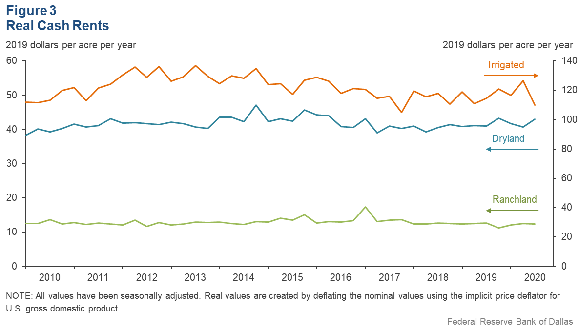Irrigated and ranchland values fell this quarter, while dryland values increased (Figure 2). According to bankers who responded in both this quarter and third quarter 2019, nominal dry and irrigated cropland and ranchland values increased year over year in Texas and southern New Mexico (Table 1).