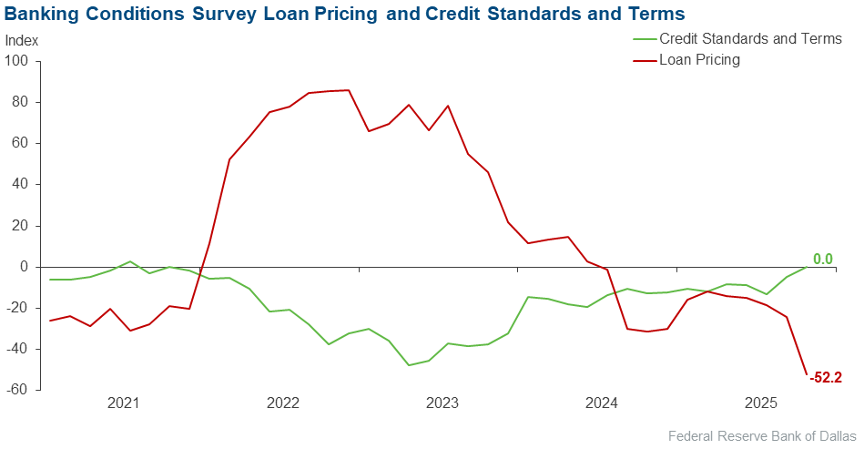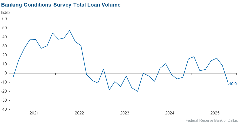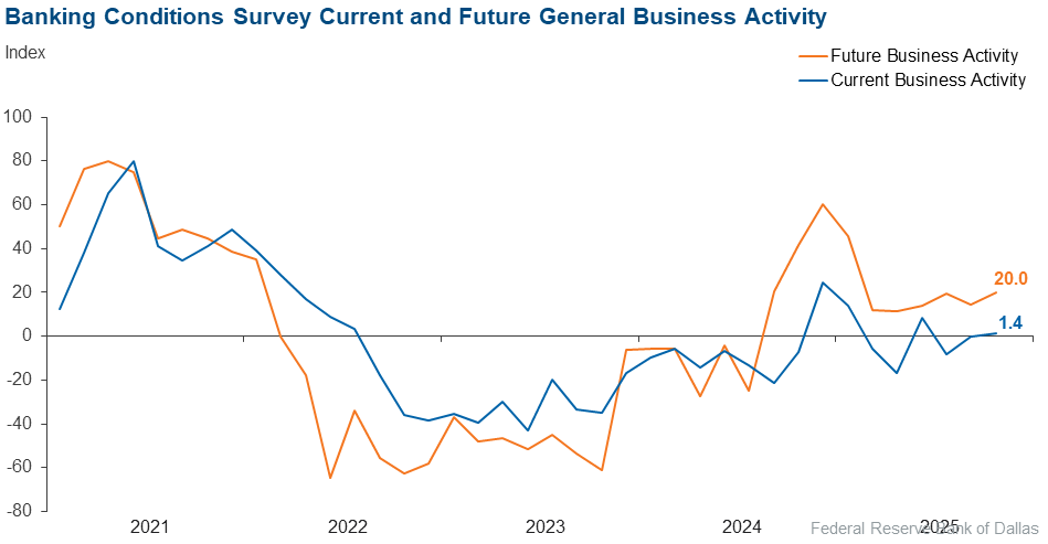 Data were collected October 28–November 5, and 70 financial institutions responded to the survey. The Federal Reserve Bank of Dallas conducts the Banking Conditions Survey twice each quarter to obtain a timely assessment of activity at banks and credit unions headquartered in the Eleventh Federal Reserve District. CEOs or senior loan officers of financial institutions report on how conditions have changed for indicators such as loan volume, nonperforming loans and loan pricing. Respondents are also asked to report on their banking outlook and their evaluation of general business activity.