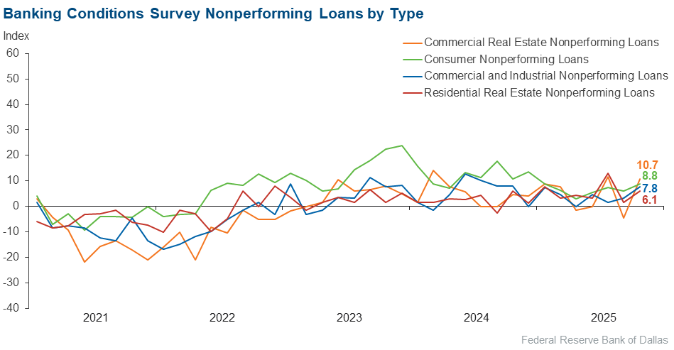 - The government shutdown is a big driver here, especially for consumers, investment real estate and commercial businesses that work with government contractors. Credit unions also remain a concern.