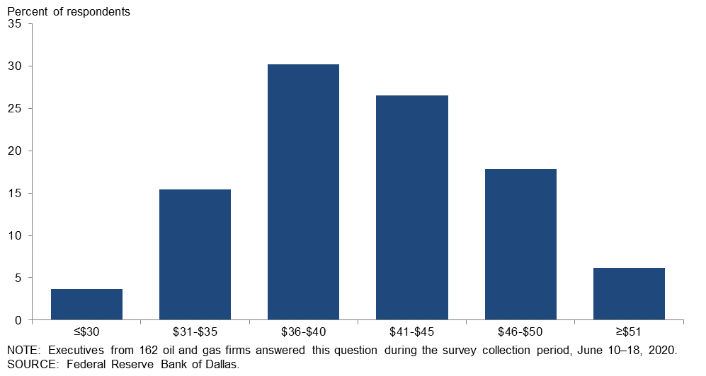 | NOTE: Executives from 85 oil and gas firms answered this question during the survey collection period, June 10–18, 2020. SOURCE: Federal Reserve Bank of Dallas. |