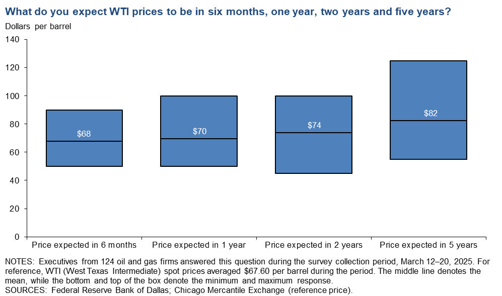 On average, respondents expect a West Texas Intermediate (WTI) oil price of $68 per barrel at year-end 2025; responses ranged from $50 to $100 per barrel. When asked about longer-term expectations, respondents on average said they expect a WTI oil price of $74 per barrel two years from now and $82 per barrel five years from now. Survey participants foresee a Henry Hub natural gas price of $3.78 per million British thermal units (MMBtu) at year-end 2025. When asked about longer-term expectations, respondents on average said they anticipate a Henry Hub gas price of $4.30 per MMBtu two years from now and $4.83 per MMBtu five years from now. For reference, WTI spot prices averaged $67.60 per barrel during the survey collection period, and Henry Hub spot prices averaged $4.10 per MMBtu.