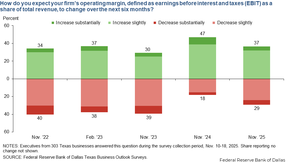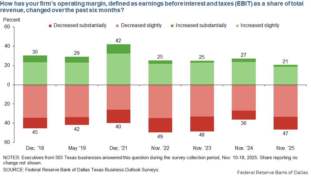 Reports of margin declines are more widespread than a year ago, and the share of Texas businesses citing decreases in margins exceeds the share citing increases. Reports of declining margins over the past six months were most common among retailers (53 percent).