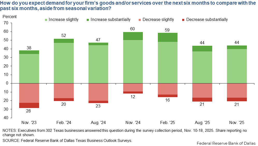 Demand expectations among Texas businesses remain bullish. Of responding firms, 44 percent expect increases in demand over the next six months, exceeding the 21 percent share expecting decreases. The balance of responses is unchanged from August but less optimistic than in February.