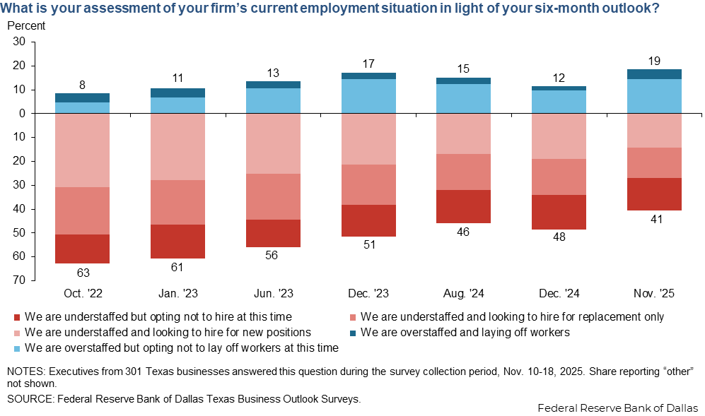About 40 percent of Texas businesses say they are currently understaffed, with 27 percent intending to hire—either for replacement or for new positions. Overall, this represents the smallest hiring share since this question was first posed in October 2022. On the flip side, about 20 percent of responding firms say they are overstaffed, representing the largest share seen thus far. Among overstaffed firms, most are opting not to lay off workers at this time.